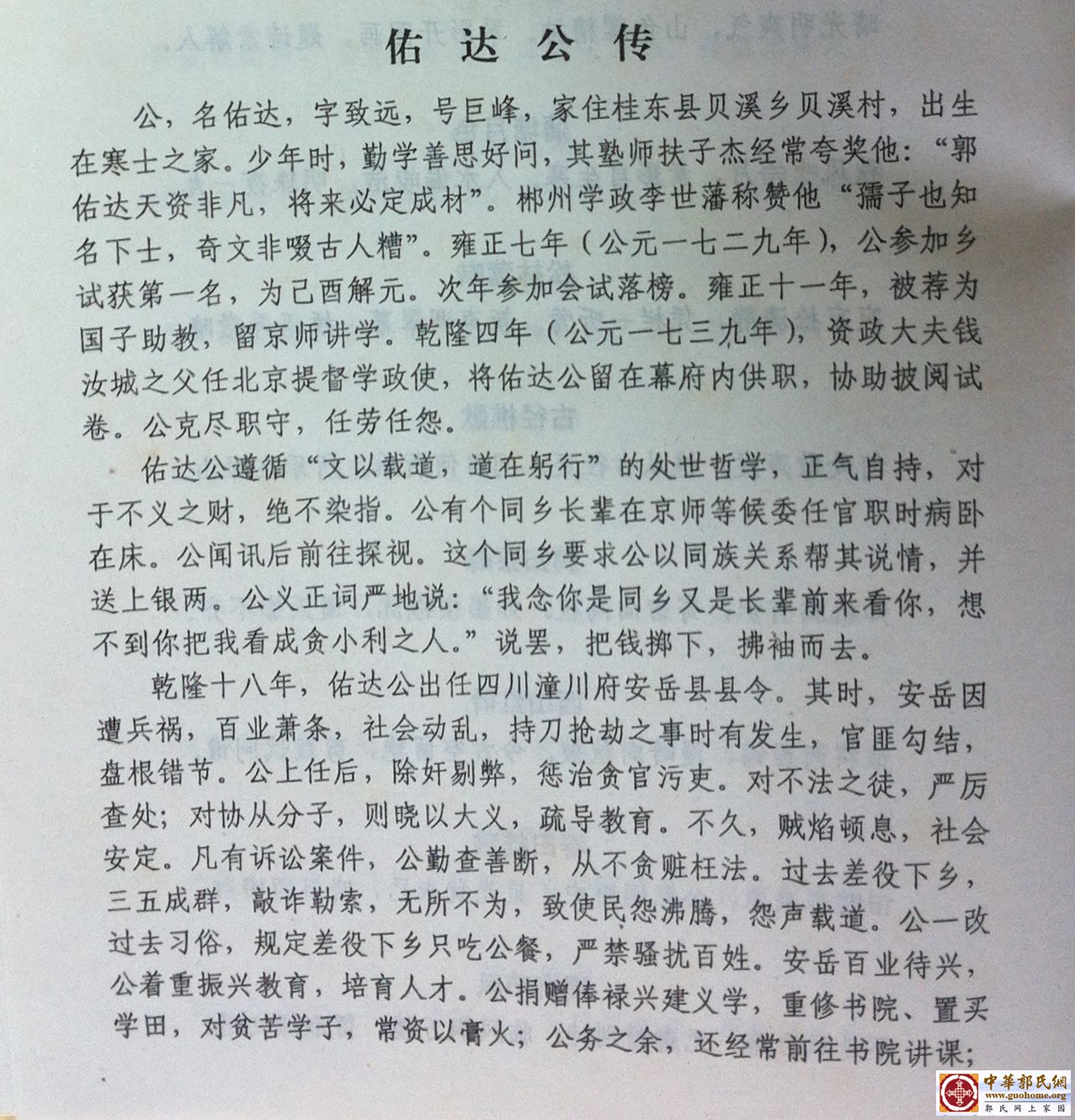 ?公,名佑达,字致远,号巨峰,家住桂东县贝溪村,出生在寒士之家。少年时,勤学善思好问,其塾师扶子杰经常夸奖他:“郭佑达天资非凡,将来必定成才。”郴州学政李世藩称赞他“孺子也知名下士,奇文非啜古人糟。”雍正七年 (公元1729年) ,公参加乡试获第一名,为已酉解元。次年参加会试落榜。雍正十一年,被荐为国子助教,留京师讲学。乾隆四年 (公元1739年) ,资政大夫钱汝城之父任北京提督学政使,将佑达公留在幕府内供职,协助披阅试卷。公克尽职守,任劳任怨。