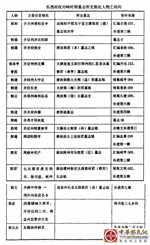 通过对现在出土的墓志分析,魏分东西以后的太原郭氏分为两类:一部分怀有武功谋略的郭氏随贺拔岳入关,在西魏北周政权下建立功业,享有盛誉;另外一部分仍然留守并州太原,出仕东魏北齐.迁往长安的郭氏尽管放弃了太原的乡里基础,世系亦颇为混乱,但是他们凭借卓越的政治才能和超群的军事谋略,获得关中政权的信赖,并由此重建枝叶繁茂的家族谱系。 太原郭氏在西魏北周政权中影响最大的人物是郭荣和郭衍。郭荣因父功而得到宇文护的重用,郭荣在齐周对抗时期的活动地域是汾州(今汾阳)、姚襄镇(今临汾市正西黄河边)之间。其时宇文护令郭荣巡视汾州,郭荣请于汾州、姚襄两城间再建一城。其后段孝先先后攻破两城,唯独郭荣所立城池完存。郭荣又于上郡、延安筑周昌、弘信、广安、招远、咸宁等五城,抵御稽胡。其后又从武帝平齐,军功显赫。。郭荣的活动区域和郭衍有些相似,即晋州和汾州之间的区域是他们活动的主要区域。郭荣所据之地所守之城正是北周赖以抗衡北齐的桥头堡。而郭荣能够成功据守,笔者推测正是因为他对于这一地带具有较强的控制力。郭荣建城防御之事,和王思政营建玉壁颇有契合之处:他们俱为太原名望,俱在东西政权对峙前沿阵地选择有利地形进行防御,和他们同为并州人物出身当有关联,他们尽管在魏分东西以后脱离太原乡土,但是其家族在并州一带仍然有不同程度的影响力.这虽然仅仅存在于推测的层面,但是前面几个表格中无论是东魏北齐还是西魏北周的太原士望,在汾州一带活动者不乏其人,即为问接证据。 ‘ 隋书>卷六十一‘郭衍传》记其郡望为。自云太原介休人”,‘郭敬宗墓志)载为“太原介休人”,而‘郭肃宗墓志》载为“太原晋阳人。,三者相互歧异,但 是可以确定的是郡望为太原无疑,之所以出现歧异,原因似乎在于郭氏该支在唐代已经远离太原介休或者晋阳之地,到郭敬宗、肃宗时追忆祖先郡望才会出现两者相异之事。两方墓志正好可以补充郭衍父亲的任官情况。墓志表明郭衍父崇(抑或是环,兹不能确定,暂取崇说。)在魏分东西时,紧密跟随魏孝武帝,颇有功业,从而得到西魏北周政权的重用。该家族到郭衍时,已经享盛名于西魏北周政权。郭衍因父崇功少年得志,起家为周陈王左右,累迁大都督.其后奉诏于天水募军,徙千余家,屯于陕城.这千余家中必然包括郭衍一系的主干。也就是说,郭衍一系随父亲入关,已经远离家族居住地,兼之父子二人均得宠北周政权,遂将家族发展重心转移至北周控制区域内.但是郭衍政治生涯中的主要活动地区是:从武帝与齐主战于晋州(今临汾),从平并州,从韦孝宽破尉迟迥之乱于相州,师入济州,剿灭迥党.2可以看出在齐周对抗时,郭衍的主要活动地为晋州、晋阳之间。这似乎暗示郭衍主系虽然远离家族居住地,但仍然和在乡势力存在着藕断丝连的关系。 为进一步讨论郭氏人物在东西政权中的动向,列表如下,以作比观。 通过上表可知,魏分东西后,郭氏亦产生东西参商的政治分野。以上共25人,除郭义分仕于齐周之外,仕于西魏北周者14人,宦于东魏北齐者12人。东魏北齐的实际控制地包括郭氏的地方聚居地,晋阳对于北齐而言,其重要性不亚于邶都.然而官于东魏北齐政权的郭氏人数却略少于西魏北周政权的人数.仕于北齐的太原郭氏,从其任官经历看,他们绝大多数都是担任地方官员,任朝廷高官者极少.所任官品分别为:齐并州晋阳县令,第六品;齐征西步兵校尉.从四品:齐并府刺史,第三品;齐定州州主簿,第六品:长史,从六品:羽林监,第六品;齐定州铠曹参军,第八品.太原郭氏在北齐任官情况反映,北齐政权对于太原郭氏的依赖程度极为有限,从另一个层面反映出北齐政权对于太原地区士族层面的渗透力度并不强劲。现在考察仕于北齐的太原郭氏子孙的仕宦情况。郭和、郭馗为父子,馗子郭提仕于隋:郭儒子益仕于隋;郭承亨子仕于隋;郭遵子难仕于隋;郭绳子贵仕于隋:郭云子康仕于隋;郭明子郭休,郭逵、郭略为父子,其子郭通隐居;这种情况标明,尽管周灭齐,隋继周,但是绝大多数仕于北齐的太原郭氏对于隋政权并没有采取抵触的情绪。归隐者仅为郭休、郭通二人,即为明证。郭氏在西魏北周政权中任地方官者凡郭通、实、徽、郭氏祖四人,其余六人俱为朝廷重臣.其子孙都仕于隋代.这些反映出周隋政权的传递并没有引起大的振荡。 |