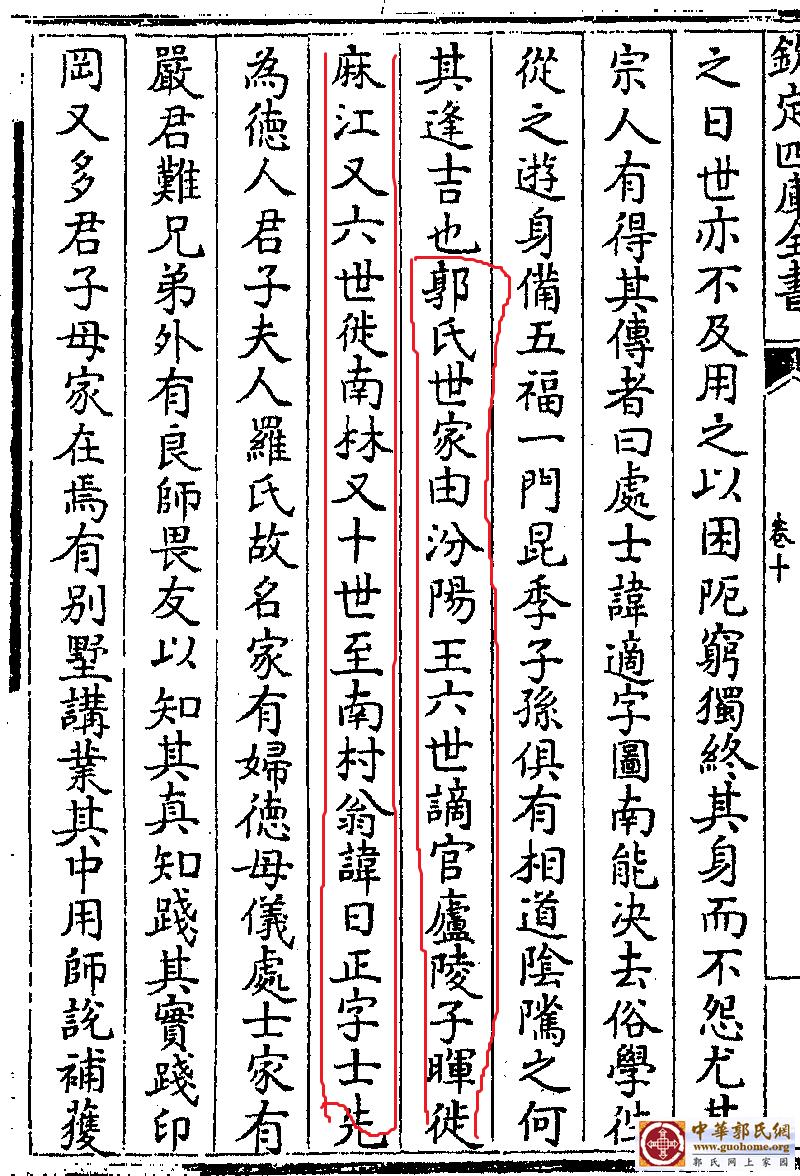 “泱泱中华,周之旧邦”。果然是“国之有史,而家亦有谱”,寻根问祖郭氏,大概无如南唐广国公后裔之幸甚了。汾阳王佐命有唐,子孙继邠、蒲之封。复至唐季,梁王朱全忠强拆长安诸里坊,亲仁里之子孙或徙河南洛阳而在徽公仕于洛阳为鸿胪少卿、或因官居外而在严公位列富平宰、或投晋王奔汾、晋而后裔有大宋助教,子孙分散矣。惟在徽公一支,于京都洛阳贬官而复徙吉州,子晖仕南唐爵广国公,其后益光。