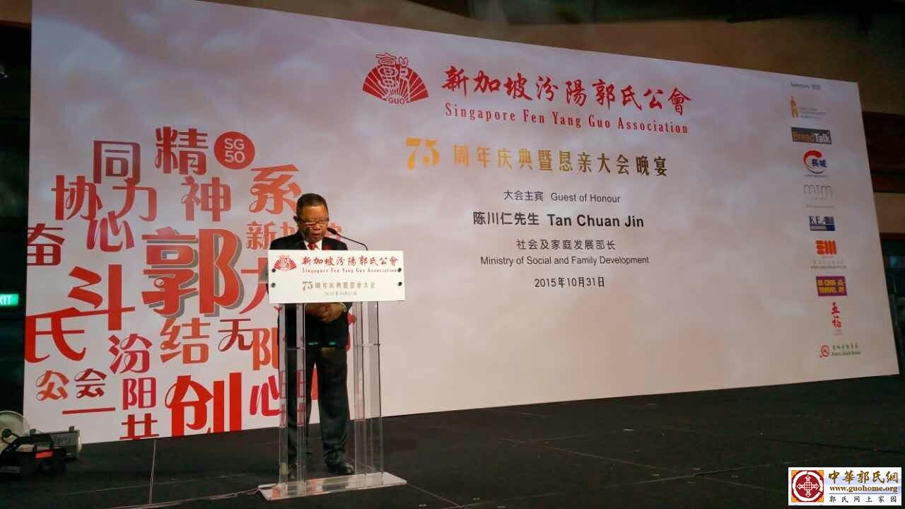 中华郭氏网新加坡讯 2015年10月31日举办"新加坡汾阳郭氏公会75周年庆典暨恳亲大会"隆重举行,大会邀请新加坡国教育部兼通讯及新闻政务部部长沈颖女士主持开幕式、社会及家庭发展部部长陈川仁先生参加庆典晚宴,四位郭氏名人与大家一起分先享成功经验,全球郭氏将有近千人与会。 应新加坡汾阳郭氏公会邀请,中华郭氏网组织全国来自12省郭氏宗亲代表一行22人组团参加"新加坡汾阳郭氏公会75周年庆典暨恳亲大会",受到新加坡汾阳郭氏公会各位宗长的热情欢迎。