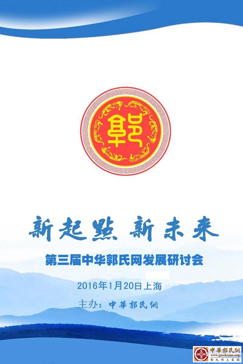 各位会员: 为了建设好中华郭氏网,进一步开展中华郭氏文化研究和联谊活动,健全管理组织体系,明确下一步工作目标,听取广大会员、宗亲对今后工作的意见和建议,服务好郭氏宗亲,中华郭氏网先后于2012年10月28日在北京召开第一届中华郭氏网发展研讨会;2013年11月7日在陕西省咸阳市第二届中华郭氏网发展研讨会。现决定召开“第三届中华郭氏网发展研讨会”,有关事项通知如下: 一、会议名称: 第三届中华郭氏网发展研讨会 上海市(报到地点待通知)。 报到:2016年1月19日报到。 会议:2016年1月20日上午。 四、参会人员: 中华郭氏网版主以上会员; 本次会议为中华郭氏网内部交流研讨会,相关会员有意参加报名均需初步审核后会公布正式参会名单。 五、会议主题:研讨课题拟定: 1、十周年庆典和下年度工作计划和安排。 2、中华郭氏网组织机构的建立; 六、会议费用:费用自理。 中华郭氏网是一个公益、睦族的网上交流平台,近十年来,很多宗亲为了收集资料、家谱和联谊家族付出了心血。因此也请广大会员对上述议题发表建议,并在中华郭氏网[站务管理]版发帖,十分感谢!