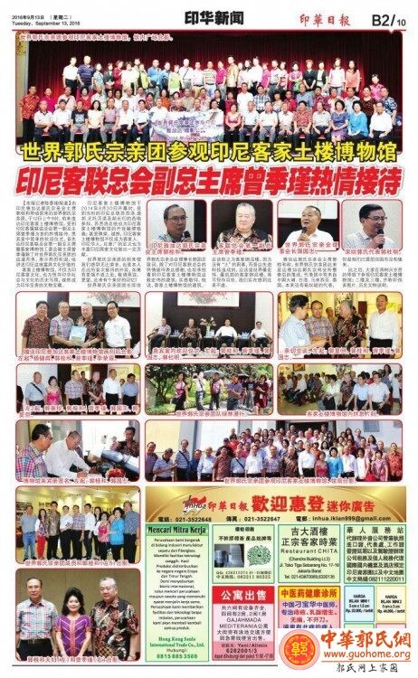 中华郭氏网印尼雅加达讯(郭光遇) 9月12日,印尼郭氏宗亲总会新会所落成典礼暨秋祭活动隆重举行。新加坡、马来西亚、台湾等各地宗亲到会祝贺。中华郭氏宗亲理事会(筹)、中华郭氏网祝印尼郭氏宗亲总会新会所落成典礼暨秋祭活动圆满成功。 印尼媒体报道: 1、印华日报。 【本报讯】9月11日,印尼郭氏宗亲 总会会所落成启用典礼隆重举行。来自国内外郭氏宗亲代表登堂祝贺、同敬祖恩。其中有台北世界郭氏宗亲总会会长郭国志及代表团、中国大埔汾阳郭氏宗亲会长郭 洪及代表团、马来西亚霹雳郭氏公会会长郭文池及代表团、新加坡汾阳郭氏公会会长郭绪泽及代表团、香港汾阳世家崇德会郭德新宗长及代表团、万隆郭氏宗亲会郭 彩新宗长及代表团、坤甸汾阳世家郭永庆宗长及代表团。印华百家姓协会中央理事会林万金总主席也是座上贵宾。 印尼郭氏宗亲总会郭桂和会长称,为 了追祖寻根,承先启后,继往开来,团结及造福宗亲,在宗亲们的共同努力下,郭氏宗亲总会终于建竣,并于今天大家齐集在这里举行开幕启用典礼,诚是可喜可 贺,感激宗亲们的热忱支持。郭桂和指出,宗亲会之落成启用不谨是一项成就,也是显示郭氏宗亲上下齐心,发挥毅力和潜能的团结合作表现,加上热心人士的热忱 支持及办事责 无旁贷的现任理事、会员们出钱出力,精诚合作所促成。本着天下郭氏一家亲的宗旨,传承中华美德,尊崇孝悌,敬宗睦族,诗礼传家,源远流长及报效国家,每年 举行春秋二祭,不仅缅怀祖先,慎终追远,还能进一步团结宗亲。新会所让我们有了一个可供今后会员联系和交流更好的地方。郭桂和冀年青一辈宗亲参会,积极参 与各项活动,相互交流,共同进步。 印尼郭氏宗亲总会常务主席郭復旦也发言,感谢各国各地宗亲的光临,希望祖先在天之灵保佑大家平安健康,国泰民安、风调雨顺。 印尼郭氏宗亲总会开幕启用典礼后,国内外郭氏宗亲在渔家庄酒楼共进午餐,来自国外郭氏宗亲代表对印尼郭氏宗亲总会会所落成启用致祝贺词;然后一起参观了郭桂和会长创立的慈育大学;晚间在郭桂和私宅欢聚晚餐,气氛欢欣融洽。 本报记者刘议华报道 |