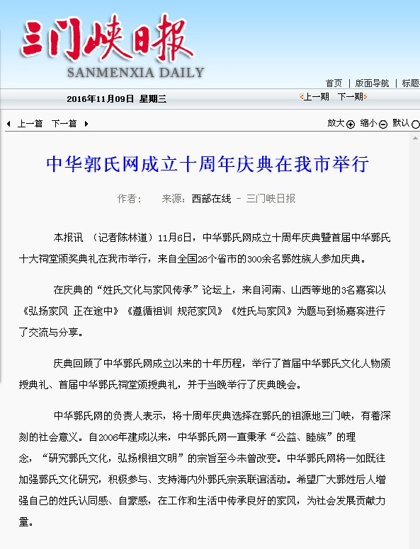 本报讯 (记者陈林道)11月6日,中华郭氏网成立十周年庆典暨首届中华郭氏十大祠堂颁奖典礼在我市举行,来自全国26个省市的300余名郭姓族人参加庆典。 在庆典的“姓氏文化与家风传承”论坛上,来自河南、山西等地的3名嘉宾以《弘扬家风 正在途中》《遵循祖训 规范家风》《姓氏与家风》为题与到场嘉宾进行了交流与分享。 庆典回顾了中华郭氏网成立以来的十年历程,举行了首届中华郭氏文化人物颁授典礼、首届中华郭氏祠堂颁授典礼,并于当晚举行了庆典晚会。 中华郭氏网的负责人表示,将十周年庆典选择在郭氏的祖源地三门峡,有着深刻的社会意义。自2006年建成以来,中华郭氏网一直秉承“公益、睦族”的理念,“研究郭氏文化,弘扬根祖文明”的宗旨至今未曾改变。中华郭氏网将一如既往加强郭氏文化研究,积极参与、支持海内外郭氏宗亲联谊活动。希望广大郭姓后人增强自己的姓氏认同感、自豪感,在工作和生活中传承良好的家风,为社会发展贡献力量。 光明网:http://news.gmw.cn/newspaper/2016-11/09/content_117851818.htm |