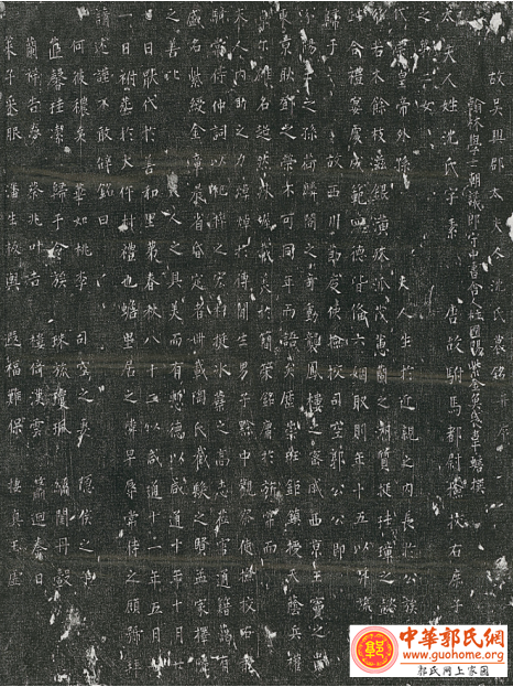 故吴兴郡太夫人沈氏墓铭并序 翰林学士朝议郎守中书舍人柱国赐紫金鱼袋韦蟾撰 太夫人姓沈氏,字素,唐故驸马都尉、捡校右庶子沈宇之第二女,代宗皇帝外孙。夫人生扵近亲之内,长扵公族之间兮!若木余枝滋银潢殊。派茂蕙兰之淑,质挺珪璋之懿。所举趾合礼,宴处成范,四德皆俻,六姻取则。年十五,以笄旒仪归于故西川节度使、捡校司空郭公。公即汾阳王之孙,荷麟阁之奇勋,袭凤楼之密戚,西京王宾之贵、东京耿、邓之荣,不可同年而语矣!历崇班巨镇,授天荫兵权,卓尔雄名,超然殊喔,载美扵简荣,铭庸扵旗常。而夫人内助之力,焯焯扵传间,生男子黔中观察使、捡校右散骑常侍仲词,以祀粹之宏材,挺冰糵之高志,莅官通籍,譪有盛名,紫绶金章,晨省昏定者卌载。陶氏截县之贤,孟家择隣之善,比夫人之具,美而有惭德。以咸通十年十月廿七日,厌代扵善和里苐,春秋八十二。以咸通十一年五月廿一日祔葬扵大仵村,礼也!蟾里居之隣,早辱常侍之顾,号拜请述,谨不敢辞。铭曰: 何彼穠矣,华如桃李。 司空之妻,隐侯之子。 茝馨珪洁,归于令族。 珠旒琼珮,绣闺丹毂。 兰祥告梦,恭兆叶吉。 楼倚汉云,簘回秦日。 莱子采服,潘生板舆。 遐福难保,捿真玉虚。 〔题解〕 本文为《唐沈素墓志铭》。沈素(788—869),其先为吴兴郡人,其父沈宇官至驸马都尉、检校右庶子。吴兴沈氏为魏晋隋唐以来江东名门望族。韦蟾字隐珪,唐代京兆万年人,大中七年(853)中进士,初为山南东道节度徐商掌书记。咸通十年(869),蟾充任翰林学士、户部郎中、知制诰,迁官中书舍人。后来,蟾迁官工部侍郎、知制诰、承旨学士。改御史中丞、刑部侍郎。复改鄂岳观察使。后再征入朝中,任尚书左丞。韦蟾有诗编入《汉上题襟集》。 发布:郭文山 |