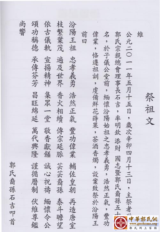 在此前后,石吉理事长与国志理事长数次率团回大陆,来汾阳、到三门峡、去华县与礼泉、今年又光临石狮市,寻根谒祖、恳亲联谊、文化交流。石吉理事长2011年在汾阳市汾阳王纪念堂谒祖时动情地讲道:“天下郭氏同根共祖,海峡两岸一脉相连”,道出了全球郭氏的共同心声。