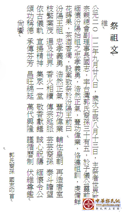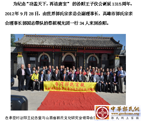 通过这一系列寻根谒祖、恳亲联谊、文化交流活动,加深了两岸友谊,增强家族凝聚,巩固了民族团结。我们衷心地感谢他们!热烈地祝贺他们!愿世界郭氏宗亲总会,继续为中华郭氏,为中华民族,做出新的更大的贡献!
