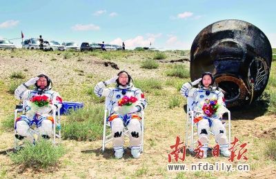 10时03分,在穿越稠密的大气层后,返回舱在内蒙古中部预定区域安全着陆。担负搜救回收任务的西安卫星测控中心所属着陆场站及时发现目标,空中搜救分队第一时间到达返回舱着陆现场。返回舱舱门开启后,经过短时间地面重力再适应,航天员景海鹏、刘旺、刘洋先后健康出舱。他们面带微笑,向前来迎接的人们不断挥手致意。