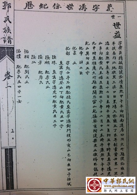 四川资中族谱记载:我祖世益公(1664 –卒庚辰年),字舜臣,精诚刚健,于清康熙甲午年(1714年)由湖南贝溪迁居四川大竹县,复于雍正甲辰年(1724年)迁居四川内江跳墩里三溪口白果湾,又于雍正丁未年(1727年)创业资州东一里万字沟。生五子,化帝、化柔、化都、化邵、化国。 世益公为四川资中万字沟世系之基祖,经三百年来资中郭氏人丁兴旺。子孙在世界各地发展,阀阅通籍者不知几凡。
